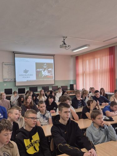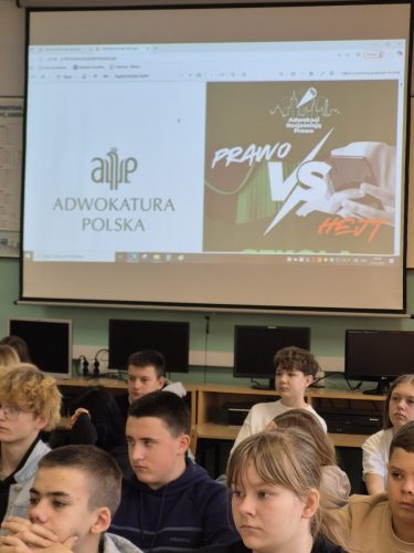 21 listopada odbyło się wyjątkowe spotkanie dla uczniów klas VIIa, VIIb i VIIIa z przedstawicielem Okręgowej Rady Adwokackiej w Koszalinie – adwokatem Dariuszem Nagórskim. Wydarzenie odbyło się w ramach IV edycji ogólnopolskiej akcji edukacyjnej „Adwokaci rozjaśniają prawo”. Tegoroczny temat: „Prawo vs. Hejt. Szkoła Wolna od Hejtu” poruszył niezwykle aktualny problem mowy nienawiści w Internecie. Uczniowie dowiedzieli się, czym jest hejt, jakie niesie skutki oraz jakie przepisy prawa go regulują. Rozmawiano o tym, jak reagować na przemoc słowną w sieci i gdzie szukać pomocy.